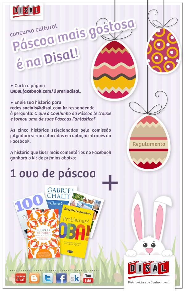 Para participar acesse www.facebook.com/livrariadisal e curta a página. Em seguida envie um email para redes.sociais@disal.com.br contando o que o Coelinho da Páscoa te trouxe e tornou a sua Páscoa Fantástica. O texto deve conter no máximo 1000 caracteres. As cinco histórias mais criativas serão escolhidas e em seguida postadas no facebook. A história que tiver o maior número de comentários, sendo que só será contabilizado 1 (um) comentário por usuário, será a vencedora e