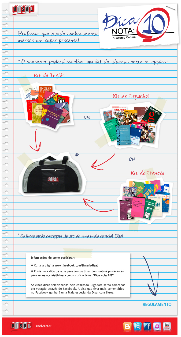 5. Para participar do concurso o participante deverá acessar a página na internet www.facebook.com/livrariadisal e selecionar a opção “curtir”. Em seguida envie um e-mail para redes.sociais@disal.com.br com uma dica de aula para outros professores. O texto deve conter no máximo 600 caracteres. As cinco dicas mais criativas serão escolhidas e em seguida postadas no facebook. A dica que tiver o maior número de comentários, sendo que só será contabilizado 1 (um) comentário por usuário, será a vencedora e ganhará uma Mala de Livros de Idioma, podendo escolher entre Inglês, Espanhol ou Francês.