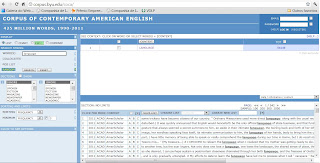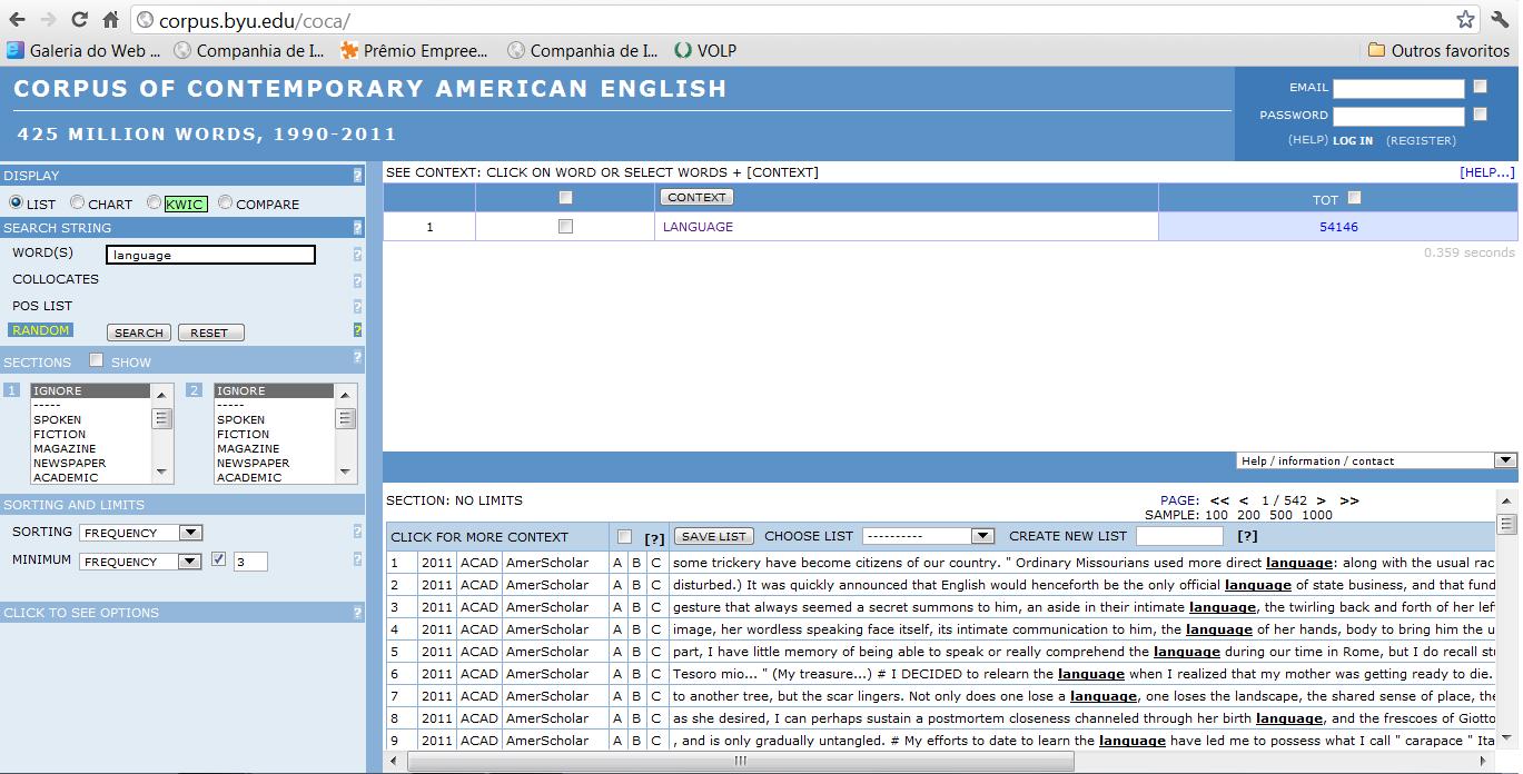 Em “words”, digite a palavra que você quer buscar; e em “collocates” digite outro termo se quiser que as duas palavras apareçam na mesma frase (os números ao lado indicam até quantas palavras antes ou depois do termo principal serão consideradas para a pesquisa do termo secundário). Nos quadros abaixo há ainda a opção de escolher linguagem oral, acadêmica, apenas de jornais, apenas de publicações de ficção etc., ou apenas clique em “ignore” para abranger tudo. Feito isso, clique em “search”, e o sistema apresenta uma janela ao lado com a palavra, o número total de “ocorrências” e, embaixo, os primeiros exemplos de frases contendo a palavra selecionada (no caso busquei a palavra “language”).