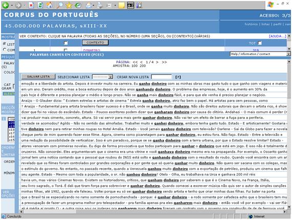 Quando clicamos sobre DINHEIRO, a janela de baixo vai exibir todas as ocorrências em que “ganhar” e “dinheiro” ocorrem juntos: