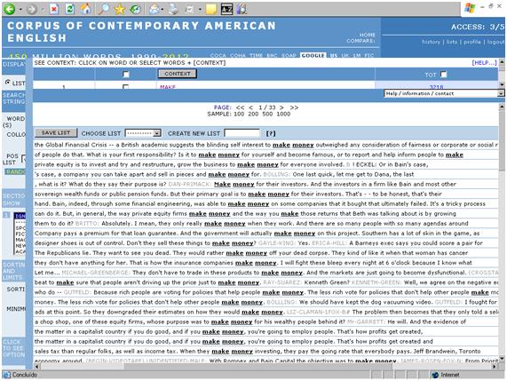 - clicamos em SEARCH(= PESQUISAR) e obtemos a lista dos verbos que co-ocorrem com maior freqüência com o substantivo “money”: