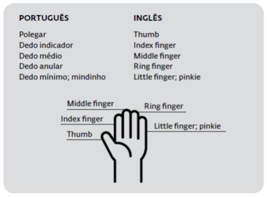 Lembre-se que, diferentemente do português, em inglês temos palavras distintas para se referir aos dedos das mãos e dos pés: fingers (dedos das mãos) e toes (dedos dos pés). Veja agora no quadro abaixo as palavras usadas em inglês para se referir aos dedos da mão: