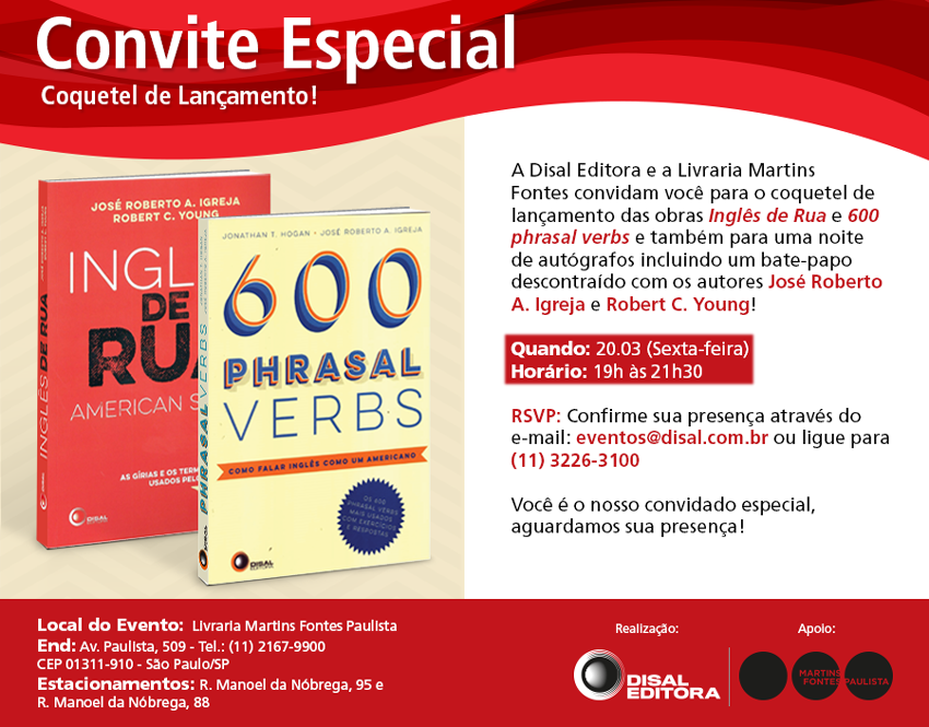 Venha participar do Lançamento dos livros Inglês de Rua e 600 Phrasal Verbs.