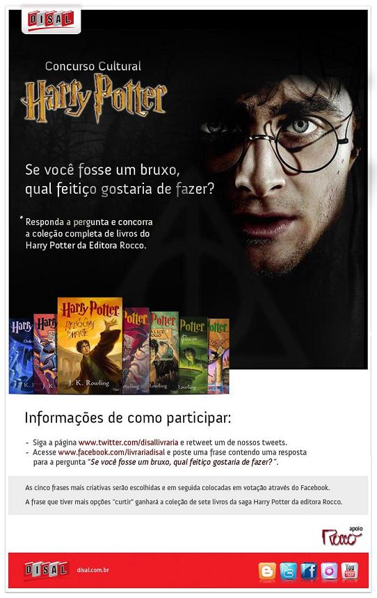 5. Para participar do concurso o participante deverá acessar a página na internet www.twitter.com/disallivraria, seguir a página e retweetar um dos tweets promocionais. Em seguida curtir a página da Disal no Facebook www.facebook.com/livrariadisal e postar uma frase contendo uma resposta para a pergunta “Se você fosse um bruxo, qual feitiço gostaria de fazer?“. As cinco frases mais criativas serão escolhidas e em seguida colocadas em votação através do Facebook. A frase que tiver mais opções “curtir” ganhará a coleção de sete livros da saga Harry Potter da editora Rocco.