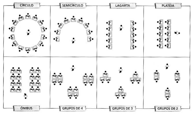 O espaço da sala também possibilita diferentes tipos de organização. Dependendo do objetivo da aula, escolha a disposição mais adequada. Veja algumas sugestões.