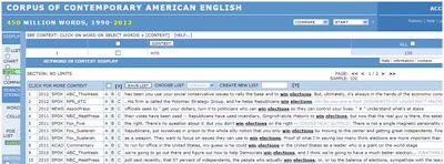 Vamos ao último desafio: “ganhar eleições”. Fazemos uma busca pela palavra electionsprecedida por um verbo. Aqui está a tela com o resultado: