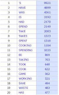 Passemos a “ganhar tempo” e vamos fazer uma busca para time imediatamente precedido de um verbo. Se vocês não lembram como fazer isso, vejam o post do mês passado. Eis o resultado: