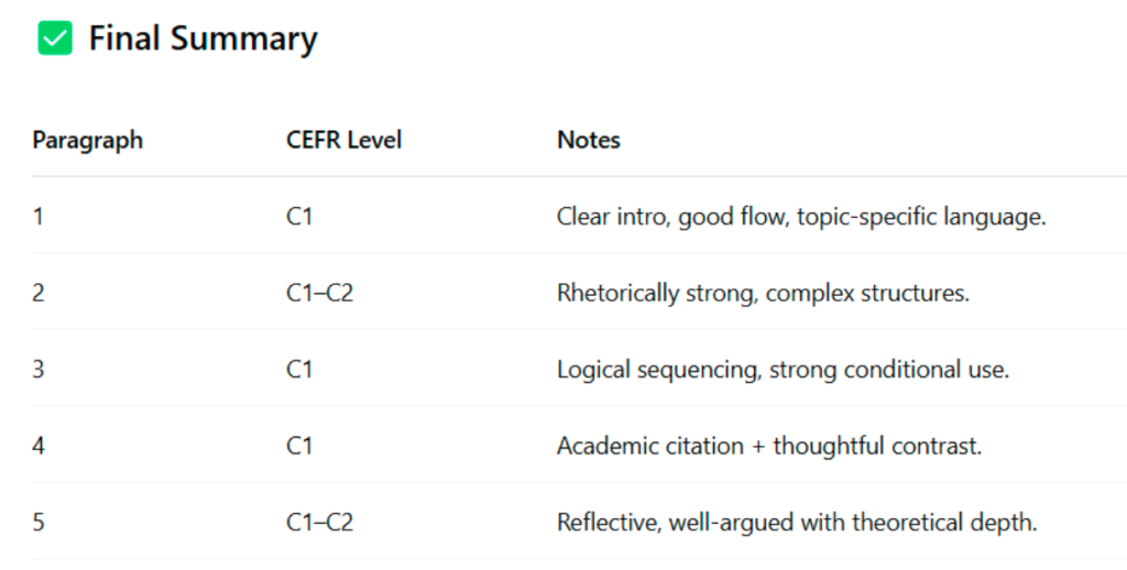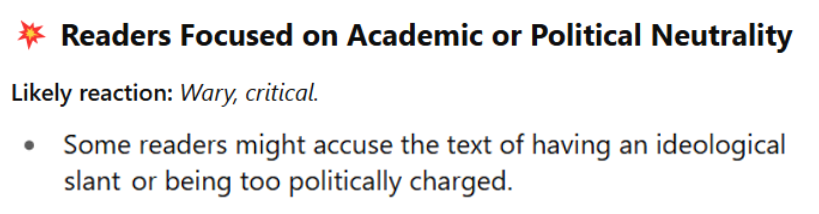 2) Another way of using AI that has been particularly helpful is using it to check how the readership may feel about your piece: not only can you ask AI if your text is clear, but you can also ask it how readers might feel when reading your text. I have received several examples of feedback which led me to see my text through the readers’ eyes.