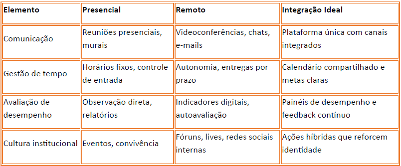 A seguir, um quadro comparativo, que ilustra como elementos da gestão educacional podem ser adaptados e integrados entre os dois formatos:
