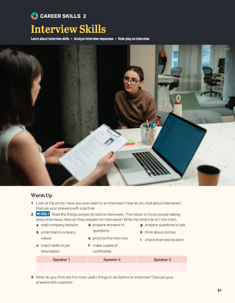 TED Talks are a great source of ideas for future-ready skills and strategies. In each level of Keynote, Second Edition, we include four new Career Skills lessons, which incorporate ideas from TED speakers. Each lesson takes an in-depth look at a specific future-ready skill in a context relevant to the modern workplace. Below is an example of a Career Skills lesson on interview skills.